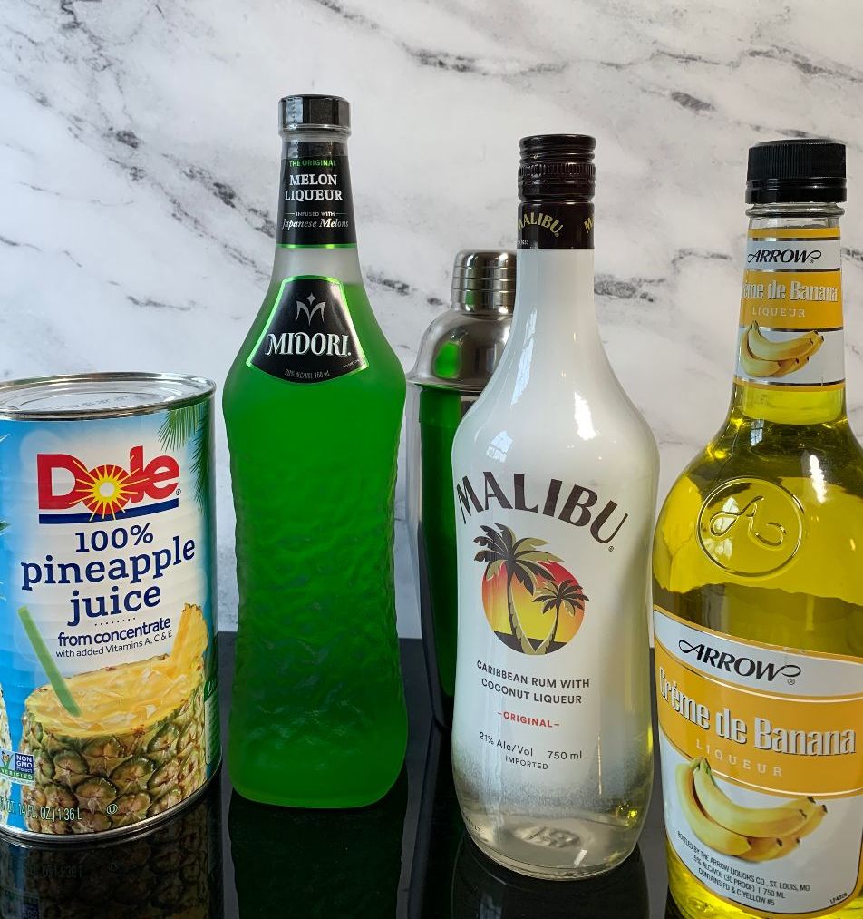 Web In a cocktail shaker with ice add coconut rum banana Liqueur melon liqueur and pineapple juice into a stainless steel shaker over ice.